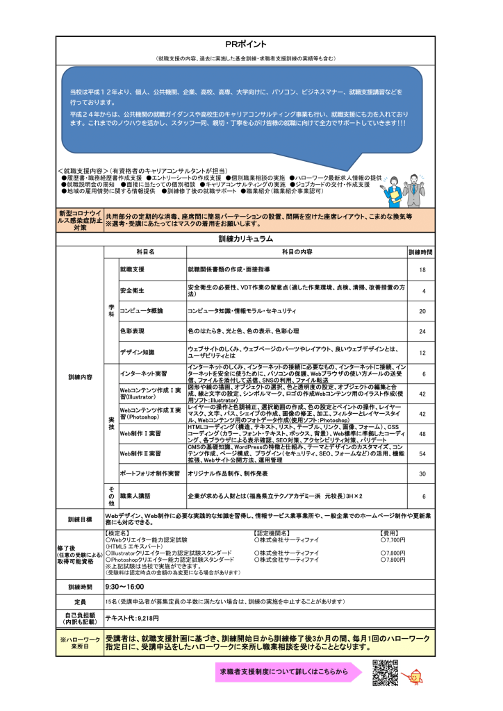 | 【費用負担】 | テキスト代 25,839円 資格取得費 Illustrator・Photoshopクリエイター能力認定試験エキスパート 各8,600円 Webクリエイター能力認定試験HTML5エキスパート 7,500円 Microsoft Office Specialist Excel365 12,980円 |