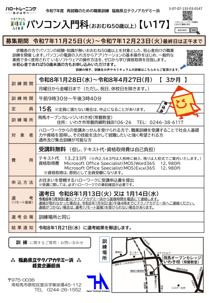 | 【訓練期間】 | 令和7年12月17日(水) ~ 令和8年3月16日(月) (3か月コース) |