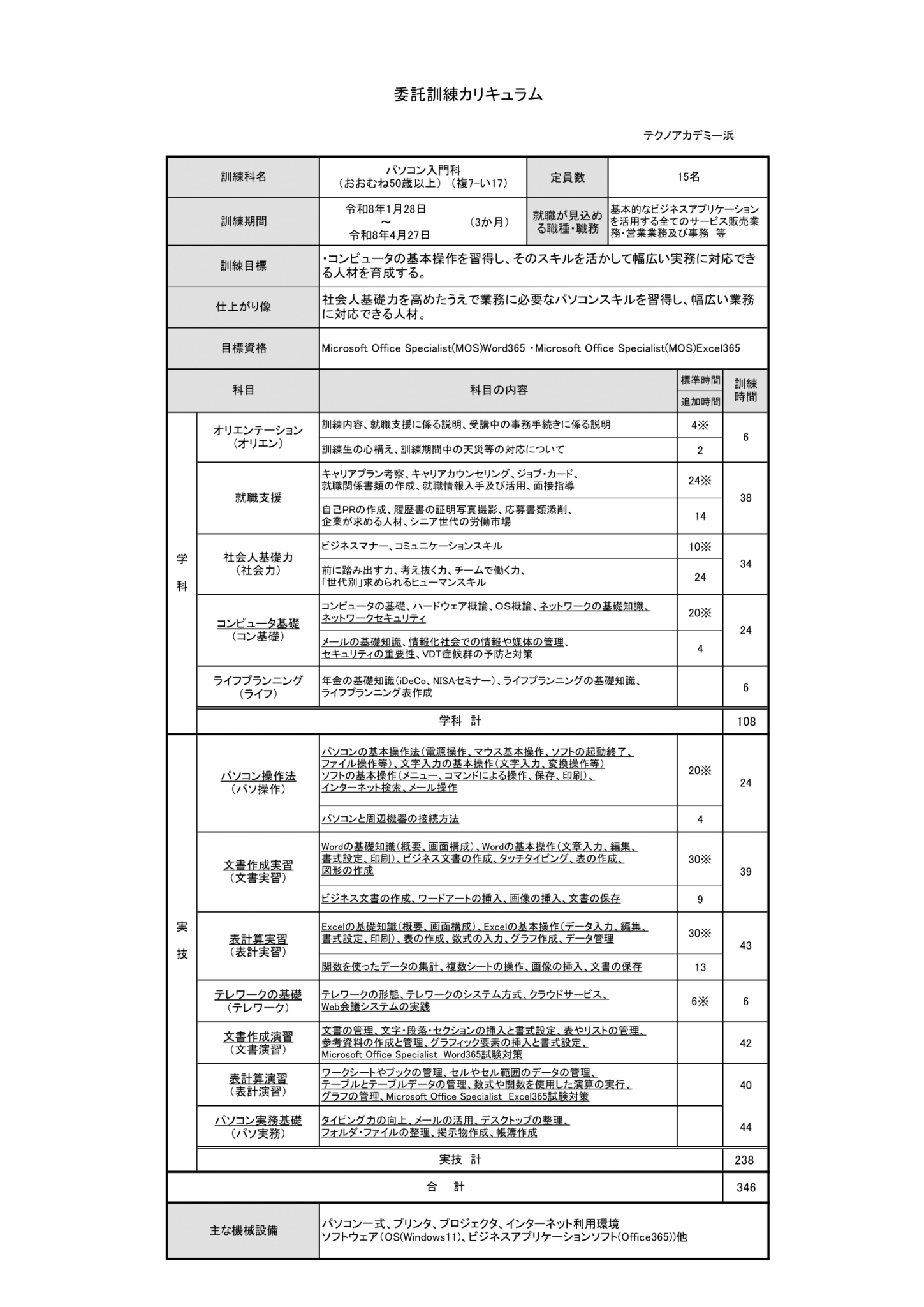 | 【訓練目標】 | コンピュータの基本操作を習得し、そのスキルを活かして幅広い実務に対応できる人材。 |